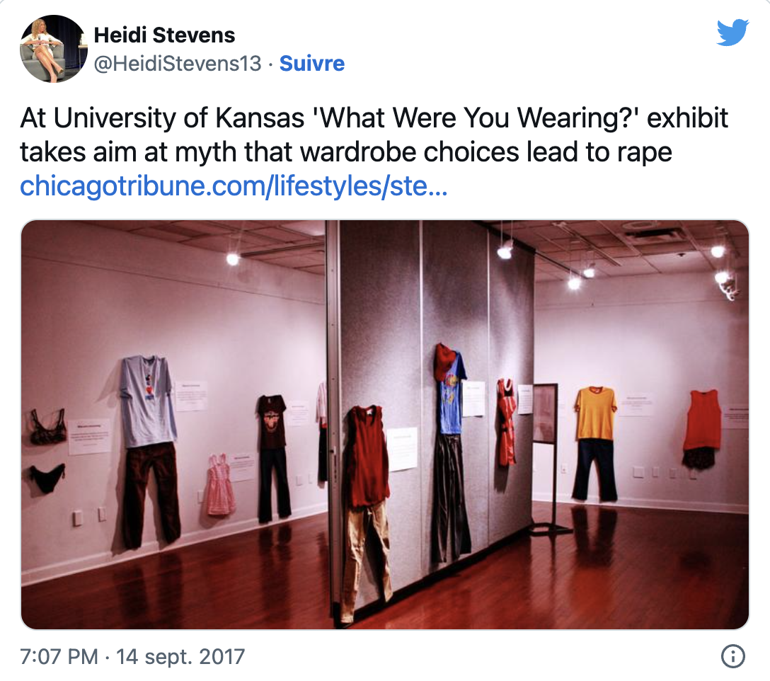- Personne n'a démontré le lien entre "tenue provocante" et "agression sexuelle". On a même plutôt démontré l'inverse, il n'y a qu'à voir les nombreuses expositions de part le monde qui exposent des vêtements de femmes victime : jeans, basketts, jogging, pyjama, djellaba. Des vêtements du quotidien, banals.